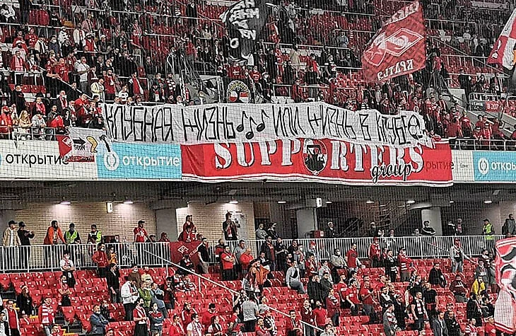 Трибуны вывесили заготовленные обращения еще перед началом. За воротами, где первый тайм провел Александр Максименко, появилось такое высказывание в двух частях: