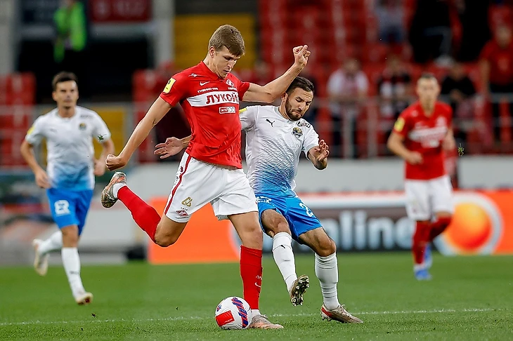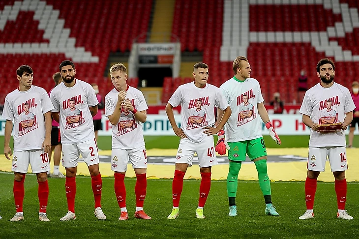 Красно-белые вышли на предматчевое построение в футболках с изображением Павла Маслова. На днях наш защитник перенес операцию из-за рецидива травмы сухожилий и вернется в строй только через несколько месяцев. Здоровья, Паша! Руй Витория решил применить новую расстановку. «Спартак» начал матч по схеме 3-4-3. Тройку центральных защитников составили Кутепов, Жиго и Джикия. Бакаев занял место на правом фланге, а Айртон — на левом. Умяров и Зобнин вышли в центральной зоне, а Ларссон, Соболев и Понсе — в нападении. Красно-белые не могли рассчитывать на Рассказова, который за пять стартовых туров успел заработать четыре желтых карточки. Зато попали в заявку Мозес и Промес, восстановившиеся от травм.
