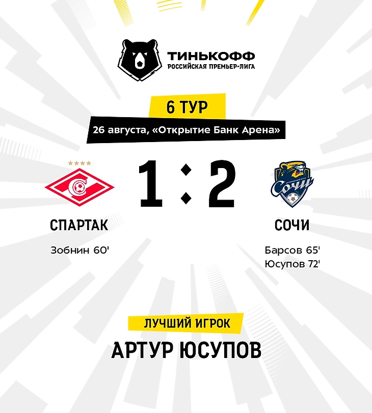«Спартак» — «Сочи» — 1:2 (0:0) Москва. Стадион «Открытие Банк Арена». 26 августа. Судья: В. Мешков (Дмитров). «Спартак»: Максименко, Кутепов (Хендрикс, 76), Джикия (к), Жиго (Ломовицкий, 85), Айртон, Умяров (Промес, 76), Зобнин, Ларссон (Игнатов, 85), Бакаев (Мозес, 56), Соболев, Понсе. Запасные: Ребров, Марков, Гапонов, Литвинов, Крал, Мирзов. «Сочи»: Джанаев, Заика, Юрганов, Маргасов, Барач (Прохин, 46), Родриго, Юсупов (Павлов, 90+1), Цаллагов, Попов (Барсов, 63), Ангбан (Нобоа, 63), Воробьёв (Жоаозиньо, 82). Запасные: Заболотный, Адамов, Колмаков. Голы: 1:0 Зобнин (60, Жиго, Ларссон, угловой). 1:1 Барсов (66, Маргасов). 1:2 Юсупов (72). Предупреждения: Ангбан (34). Зобнин (38). Маргасов (39). Родриго (41). Соболев (90+2). Хендрикс (90+3). Джанаев (90+5).