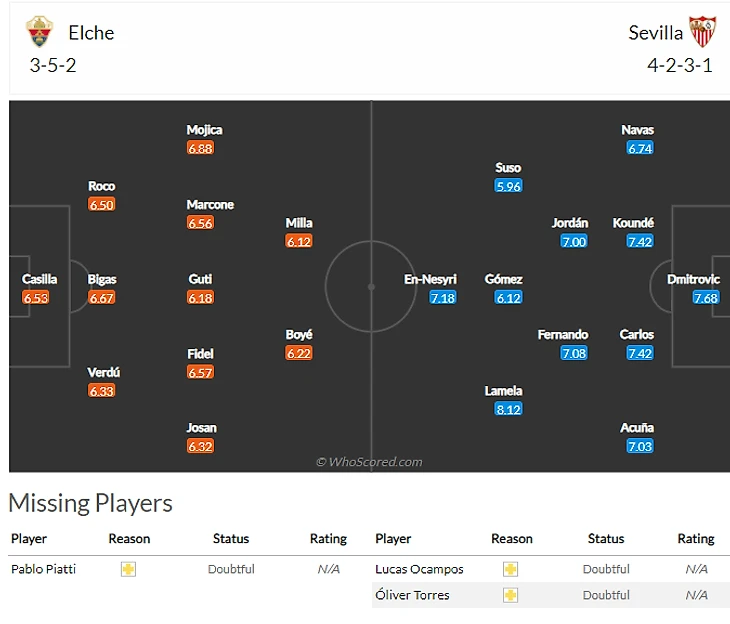 На что обратить внимание: На Жюля Кунде(6,5). Чем ближе закрытие трансферного окна, тем туманнее будущее француза. По состоянию на сейчас даже не очень ясно, появится ли он на поле Эстадио Борха Мартинес Валеро. Челси активно подкатывает к оборонцу сами знаете что, но первое предложение англичан в 50 миллионов евро Севилью не устроило.