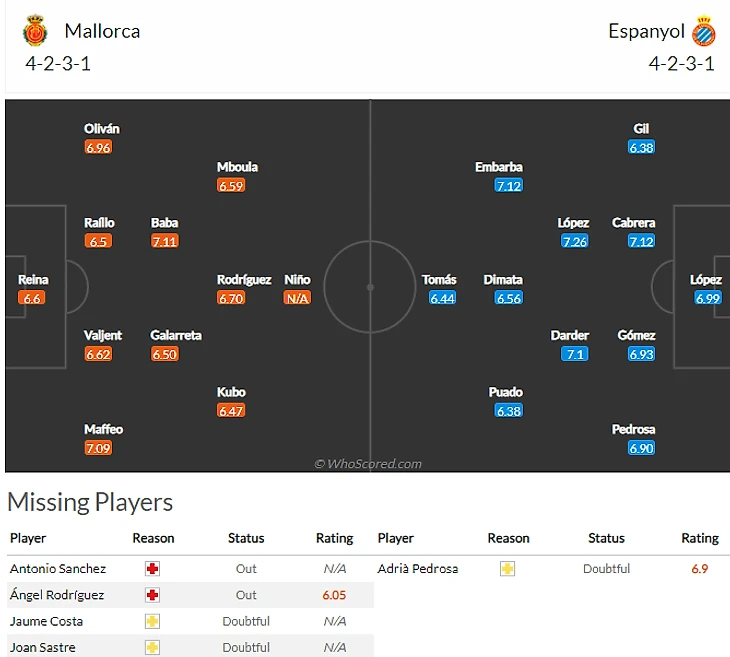 Что касается гостей, то точно не полетит на Мальорку У Лэй(6,5), которого вызвали в сборную Китая и он уже убыл в Поднебесную. Кроме азиатского вингера пропускает выезд на острова травмированный Педроса(5,5), также под вопросом выход на поле имеющего повреждение Эмбарбы(7).