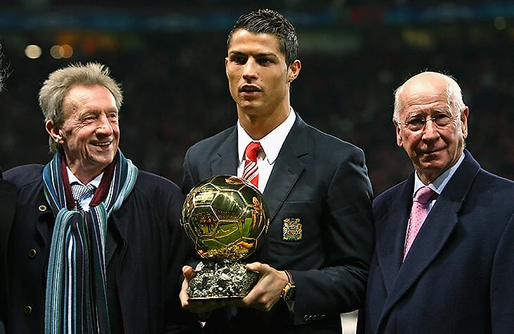 Та же история с «Золотым мячом». Сейчас их у португальца 5, но в первый раз все случилось именно в «Юнайтед». 2008 год – рядом легендарные обладатели награды Денис Лоу и Бобби Чарльтон.