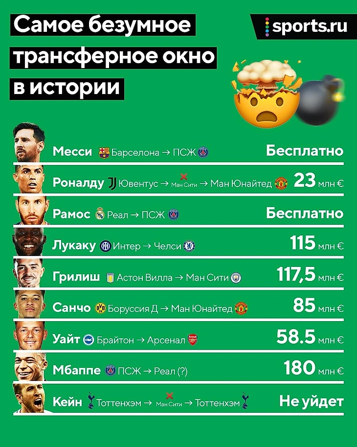 Лео Месси и Криштиану Роналду – два (возможно) лучших футболиста в истории – сменили клубы. Один из лучших (и самых результативных) защитников мира Серхио Рамос – тоже в новой команде, главный молодой талант Килиан Мбаппе вот-вот откажется от возможности поиграть с вечным талантом (Месси) и рванет в объятия самого известного футбольного президента. А «Арсенал» заплатил 50 млн фунтов за Бена Уайта.