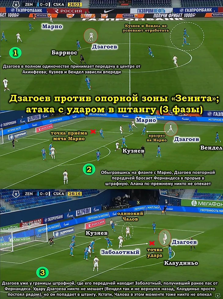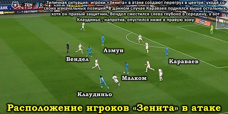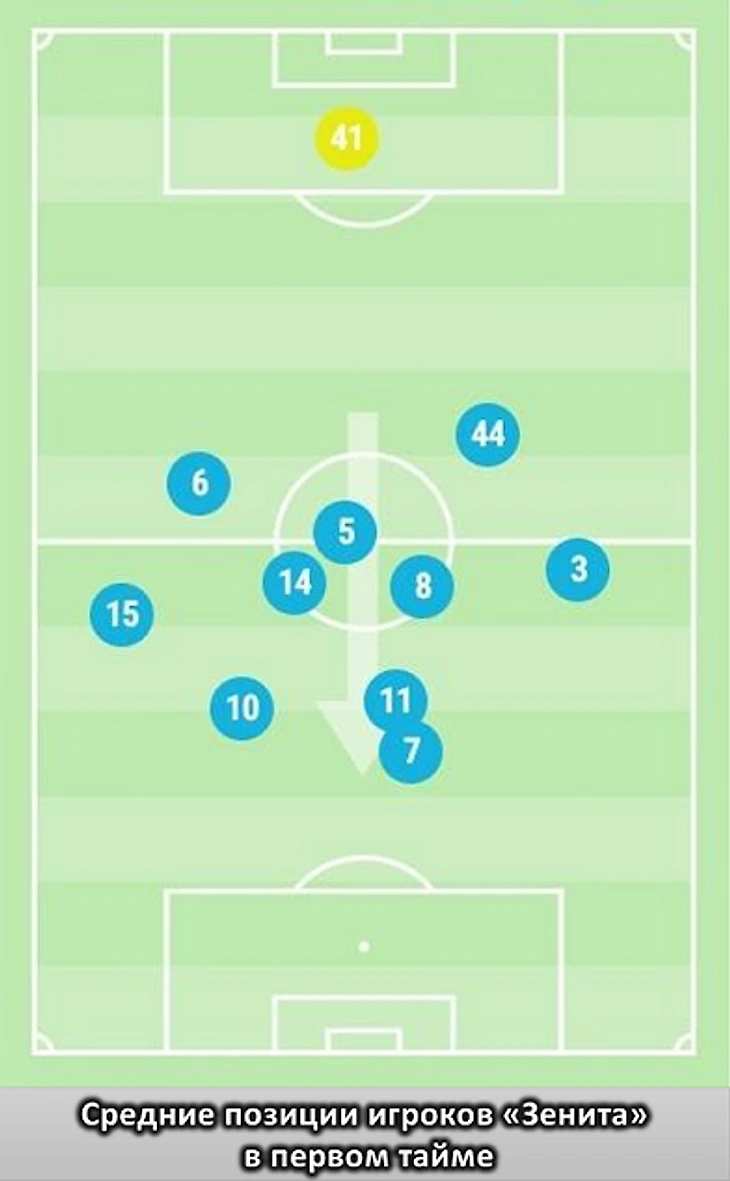 4. Семак отзеркалил схему соперника в перерыве, решив тем самым проблему в переходных фазах. Схема "Зенита" в атаке в последних матчах подразумевает под собой высокую долю импровизации, представляя из себя что-то близкое к 3-4-3 (Барриос остаётся сзади, Малком чаще других смещается ближе к центру в позицию форварда). Но в переходных фазах из-за этого проседает опорная зона, которую армейцы, выдержав стартовое давление, без проблем пролетали во второй половине первого тайма.