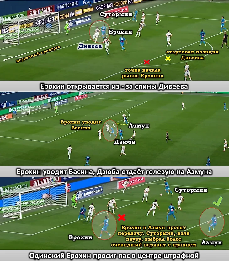 1. Ерохин — незаметный герой. Хотя для него это уже привычная роль. Все обратили внимание на голевую Дзюбы, но именно Ерохин увёл Васина и освободил коридор для передачи. Ещё дважды здорово открывался в штрафной, но партнёры его не замечали. Его в принципе не так легко обнаружить, когда он без мяча, несмотря на солидные габариты. Понимание футбола и чтение игры — из 3021 года 👽