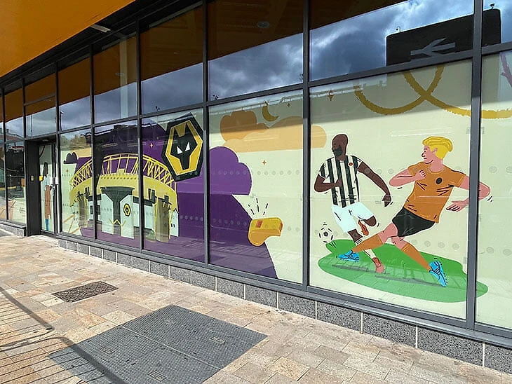 Это рекламный плакат местной железнодорожной компании (дальше на стене вокзала – пара местных достопримечательностей и абстрактные, но радостные жители города), который очень ясно характеризует место, где вы оказались. Вулверхэмптон – это город одной команды. И город, в котором футбол – одна из главных достопримечательностей.