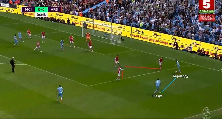 Жезус ведет борьбу один в один против Тирни, а Бернарду использует глубину атаки, подключаясь к бразильцу.