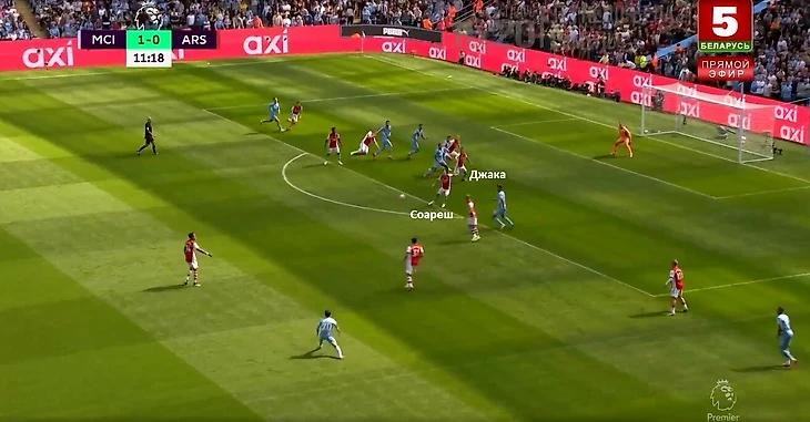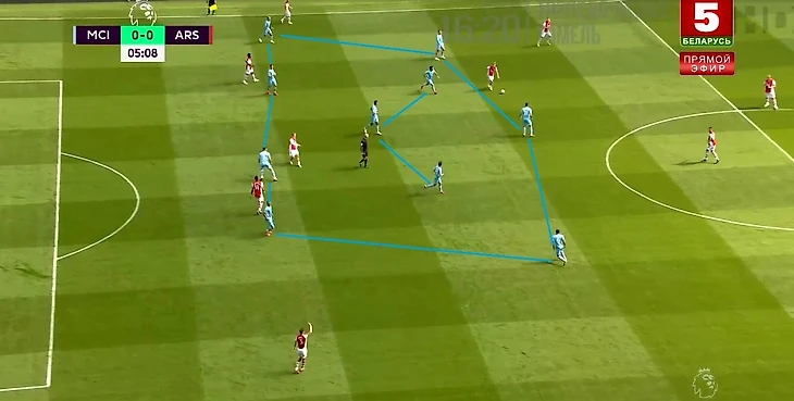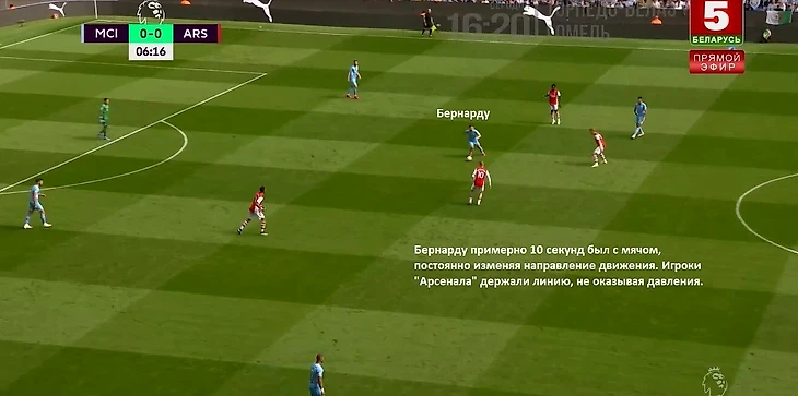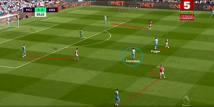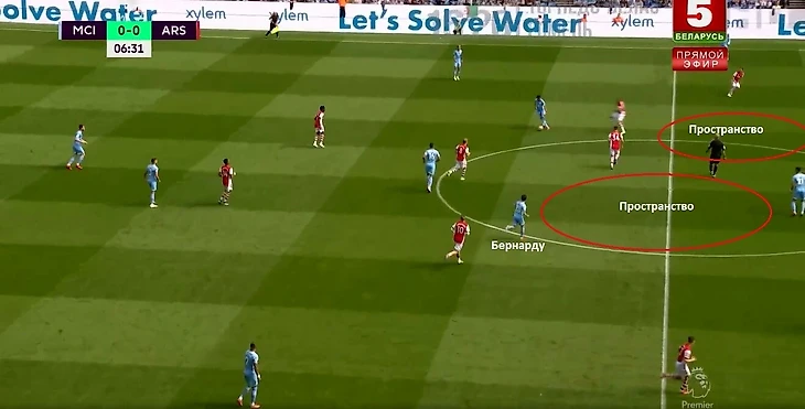 На Силву никто не давит, португалец делает ложные движения к флангу, тем самым провоцирует Тирни подняться к Уокеру. Затем возвращается обратно в центр и отдает пас Диашу. Сам Бернарду поднимается в центр. Такими перемещениями с мячом и без него он вынуждает игроков "Арсенала" подниматься в большем количестве еще выше.
