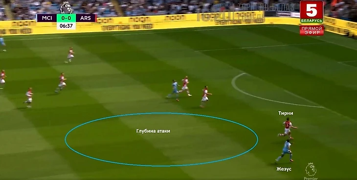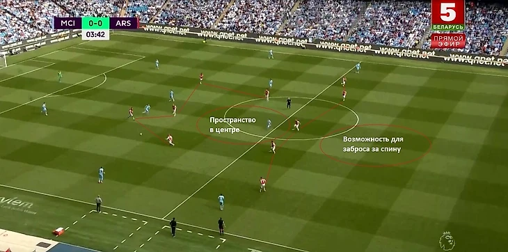 При этом в центре открываются зоны, которые можно использовать для продвижения мяча, что игроки "Сити" и делают. Показательно, именно Бернарду врывается в открытое пространство, из которого делает заброс на фланг Жезусу.