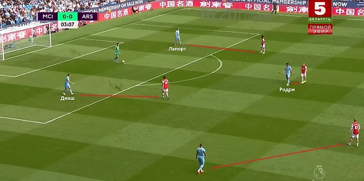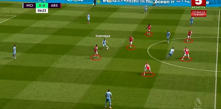 Прессинг-действия "Арсенала" заключались в персональной опеке опорного полузащитника Родри. Кроме того, по Диашу и Лапорту ориентировались Обамеянг и Сака. При этом крайние защитники "горожан" также находились в зоне риска при получении мяча: фланговые полузащитники "канониров" стремились на приеме накрывать своих оппонентов.