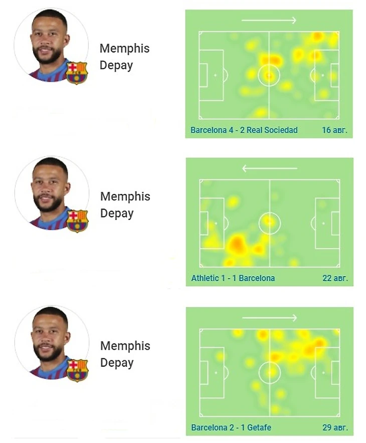Во втором туре чемпионата Испании «Барселона» встретила жесткое сопротивление со стороны «Атлетика Бильбао» на их домашнем стадионе. Напомню, что матч закончился с ничейным результатом 1:1. В этой встрече Депай встречался с мячом меньше, по сравнению с предыдущей игрой – 50 касаний мяча. Также снизилась продуктивность в созидании – отдал один ключевой пас. В том матче соперник доставлял «Барселоне» трудности, в результате которых группа атаки каталонцев не могла похвастаться результативностью и эффективностью.