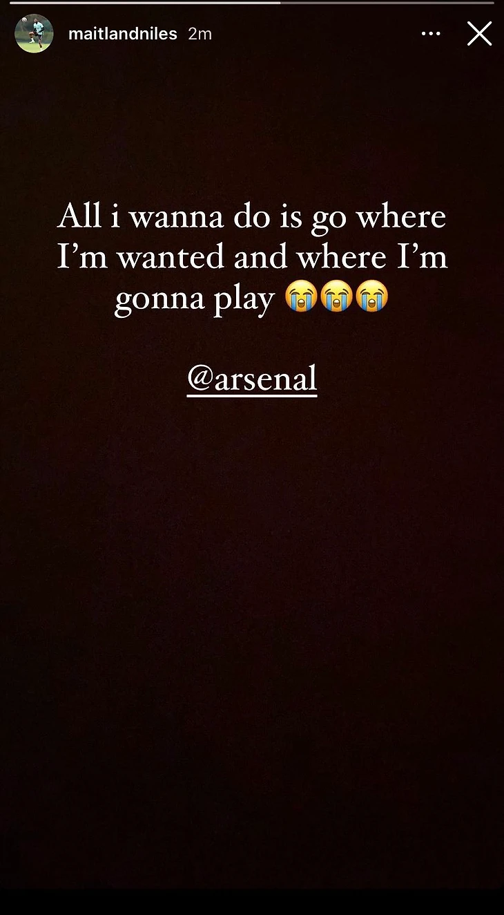 Вчера Мэйтленд-Найлз выложил сторис со словами «Все, чего я хочу, – уйти туда, где я нужен и где я буду играть». А сегодня Джон Кросс из Daily Mirror написал, что Мэйтленда-Найлза отстранили от тренировок с основным составом «Арсенала».