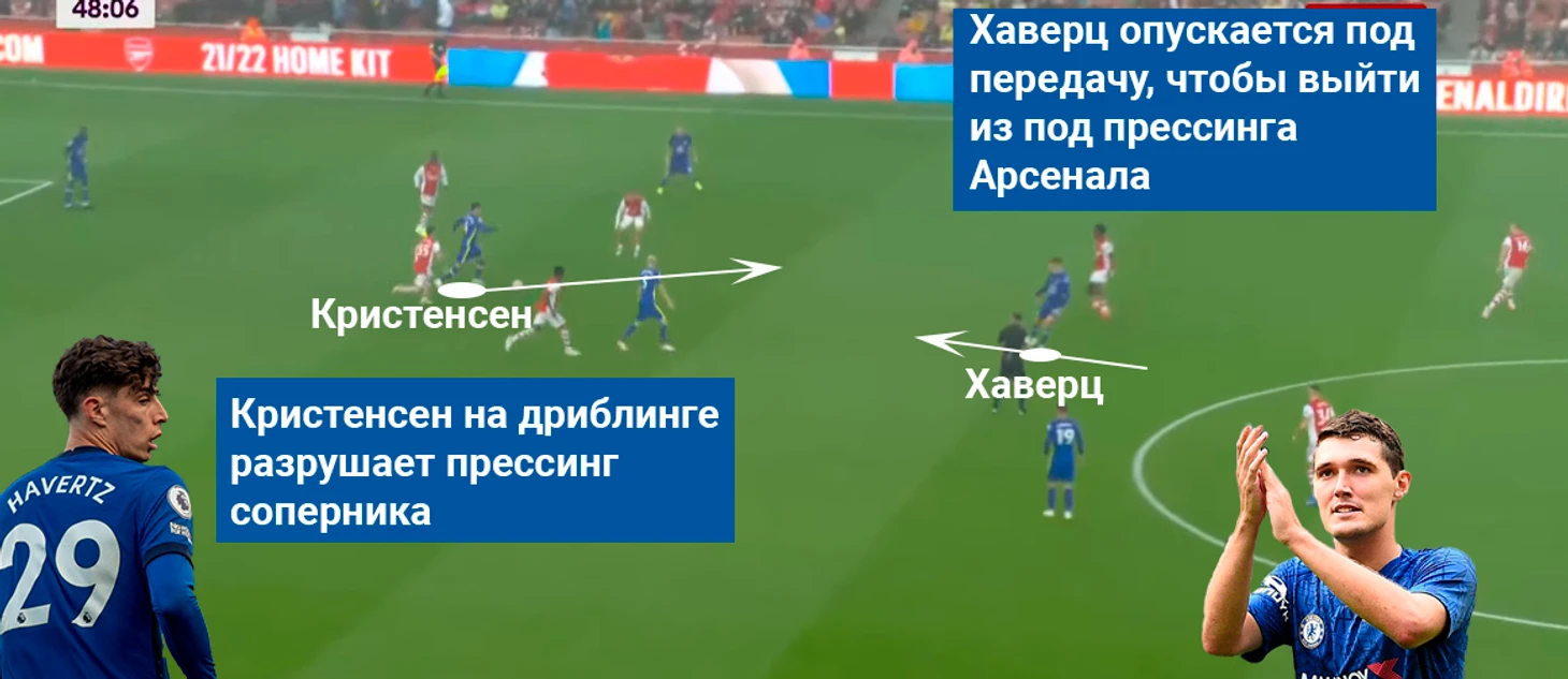 Первые два варианта выхода из под прессинга в матче с Арсеналом вы можете увидеть на скриншоте выше. Кристенсен, Рюдигер и безусловно Аспиликуэта могут успешно продвигать мяч, тем самым разрушая первую линию давления соперника. Затем Кай Хаверц своими опусканиями из тройки нападения может перегружать опорную зону, создавая преимущество 2v1, продвигая атаку в следующую стадию.