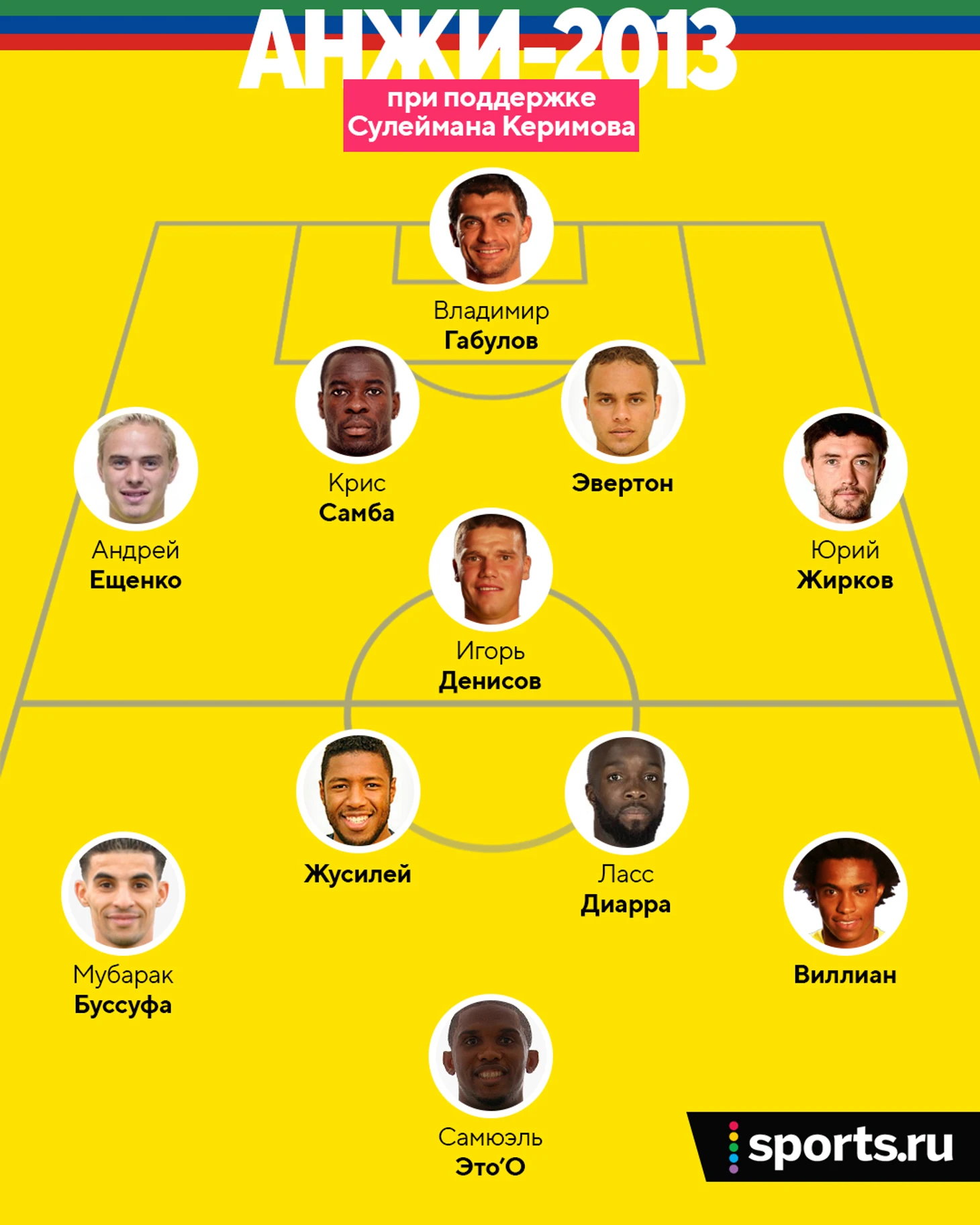 Для начала посмотрим на состав «Анжи»-2013. В команде четверо топовых россиян (Габулов, Ещенко, Жирков и Денисов), четверо качественных легионеров (Самба, Эвертон, Жусилей и Буссуфа), две звезды (Диарра и Виллиан) и одна суперзвезда (Это’О).