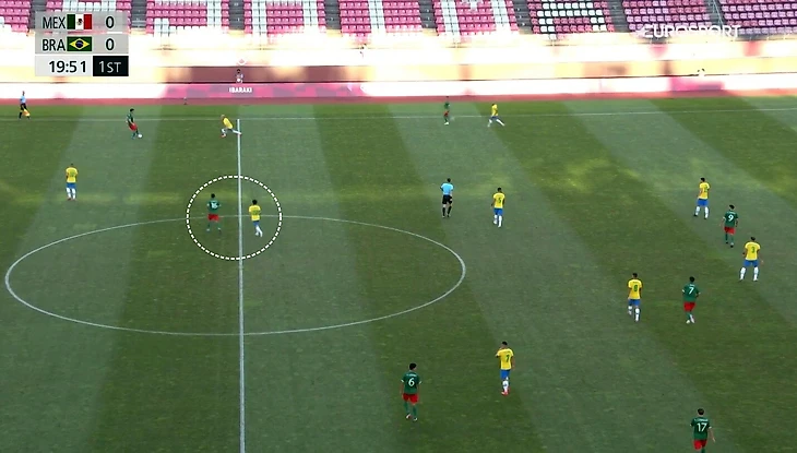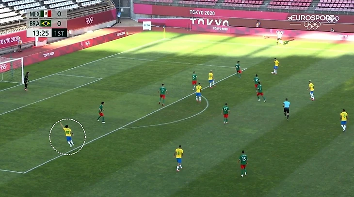 Когда клуб покупает атакующего игрока, то после оценки его прямого возможного влияния на владение команды нужно оценить и действия без мяча. Этот аспект в случае с Клаудиньо анализировать сложнее — в «РБ Брагантино» ему не давали сложных оборонительных задач и редко нагружали дополнительной информацией. Особенно выделяются стандарты у своих ворот. На угловых он в большинстве ситуаций располагался в зоне подбора, а на стандартах стоял в стенке. Очень редко ему доводилось в штрафной обороняться 1v1 по сопернику. В «РБ Брагантино» и в олимпийской сборной Бразилии чаще всего Клаудиньо в среднем блоке или в прессинге на чужой половине располагался слева или в верхней двойке в схеме 4-4-2. Визуально можно сказать, что новичок «Зенита» внимательно играет на своей позиции и может выполнять не самые сложные тренерские установки. Если он действует на фланге, то накрывает крайнего защитника соперника и не даёт ему продвинуть мяч вперёд. В первой линии прессинга Клаудиньо старательно встречает одного из центральных защитников на приёме или ориентируется по нему, если мяч у ближнего крайнего защитника. На Олимпиаде он даже получил установку прикрывать опорника сборной Мексики, по ситуации оказывая на него давление его на приёме и стараясь не давать ему времени на размышления. Если Клаудиньо выдвигался в прессинг на центрального или крайнего защитника, то одновременно перекрывал направление передач на опекаемого игрока соперника. В той игре Клаудиньо показал, что если ему понятна тренерская установка, то он со всей старательностью готов её выполнять.