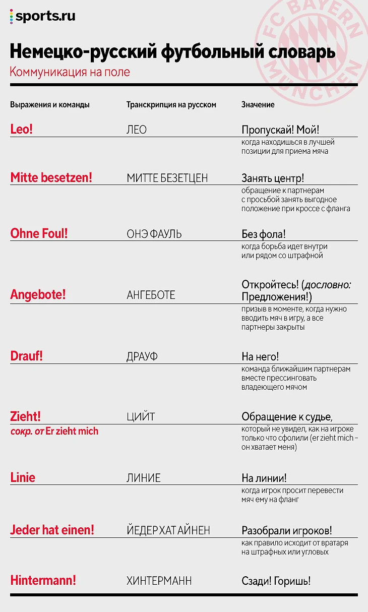Хави Мартинес после переезда в Мюнхен в 2012 году несколько дней был в замешательстве – на тренировках его партнеры все время звали какого-то Лео. Сначала он думал, что это имя недавно купленного новичка, но потом выяснилось, что в Германии так просят партнера оставить мяч (Leо!) – что-то вроде «Мой!» или «Пропускай!». В немецком есть аналог – Lass durch (Оставляй), но на поле его лучше не употреблять. Во-первых, потому что неудобно и длинно. Во-вторых, потому что так оказывается вербальное воздействие на соперника, что может привести к карточке за неспортивное поведение.