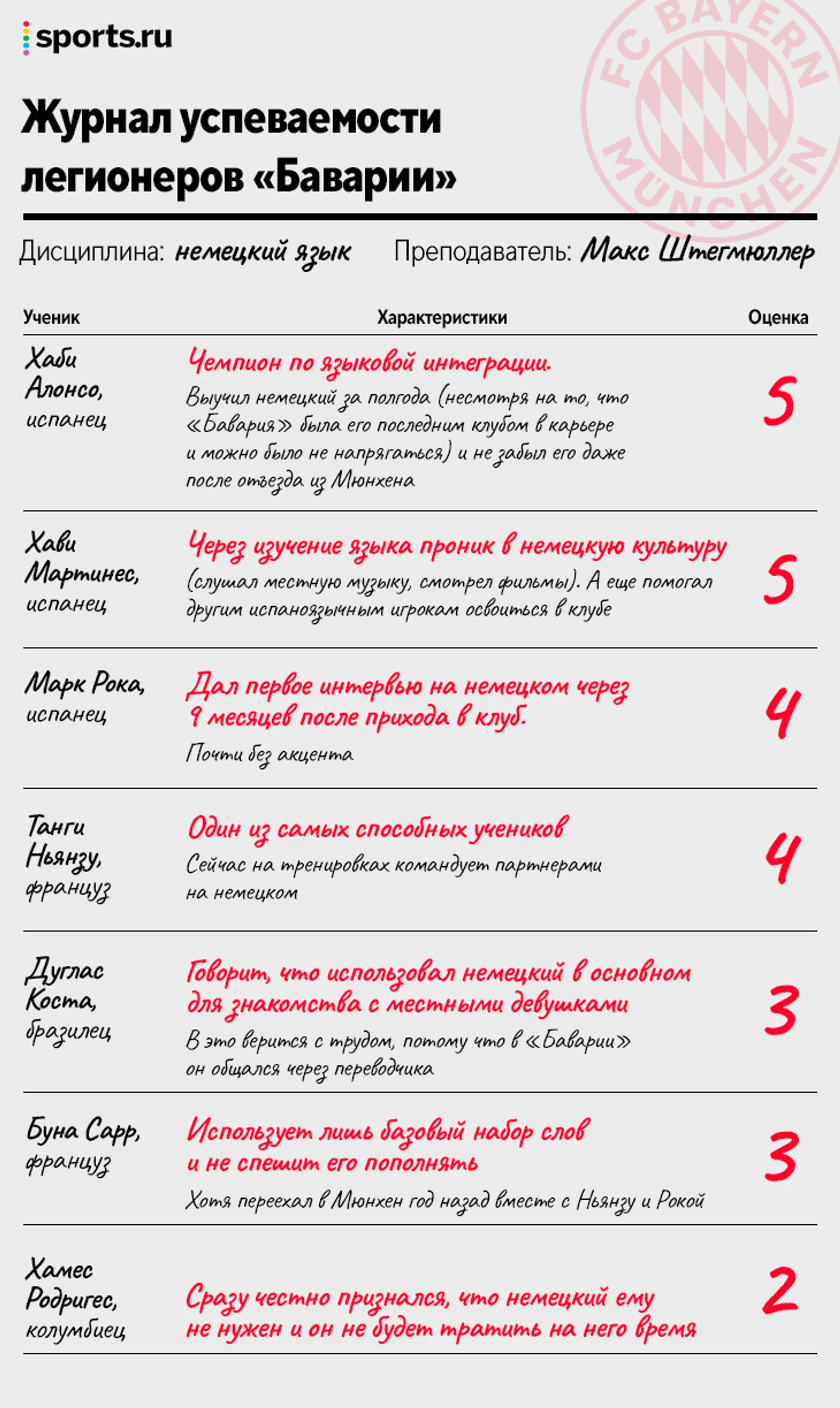 «Бавария» не исключение. Всю информацию (расписание тренировок, планы путешествий, маркетинговые мероприятия) легионеры получают от менеджера команды на немецком. Раньше клуб отправлял иностранцев в различные языковые школы в пределах Мюнхена, но такой подход оказался неэффективным, потому что у игроков слишком плавающий график (матч посреди недели или внеплановое обследование у доктора рушили всю систему).