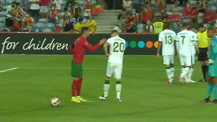 Криштиану установил мяч и готовился бить, но игрок национальной команды Ирландии, О’Ши, подло откинул мяч, после чего португалец ударил его в плечо.