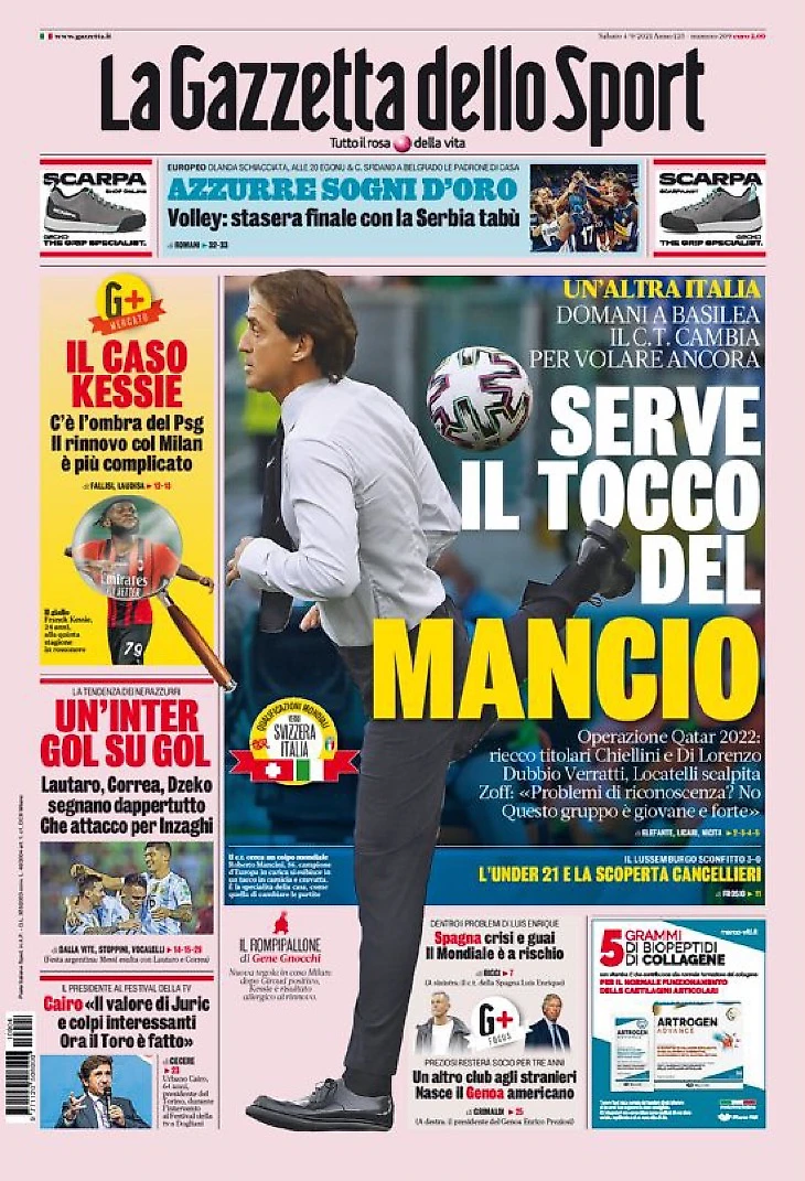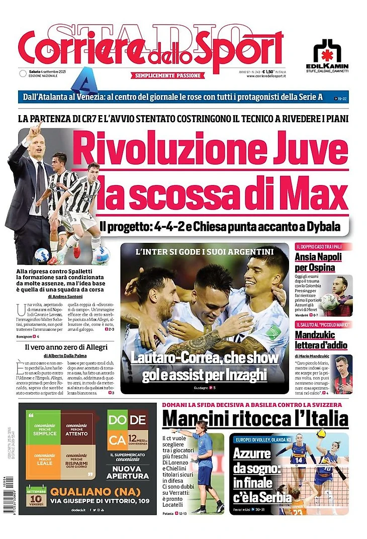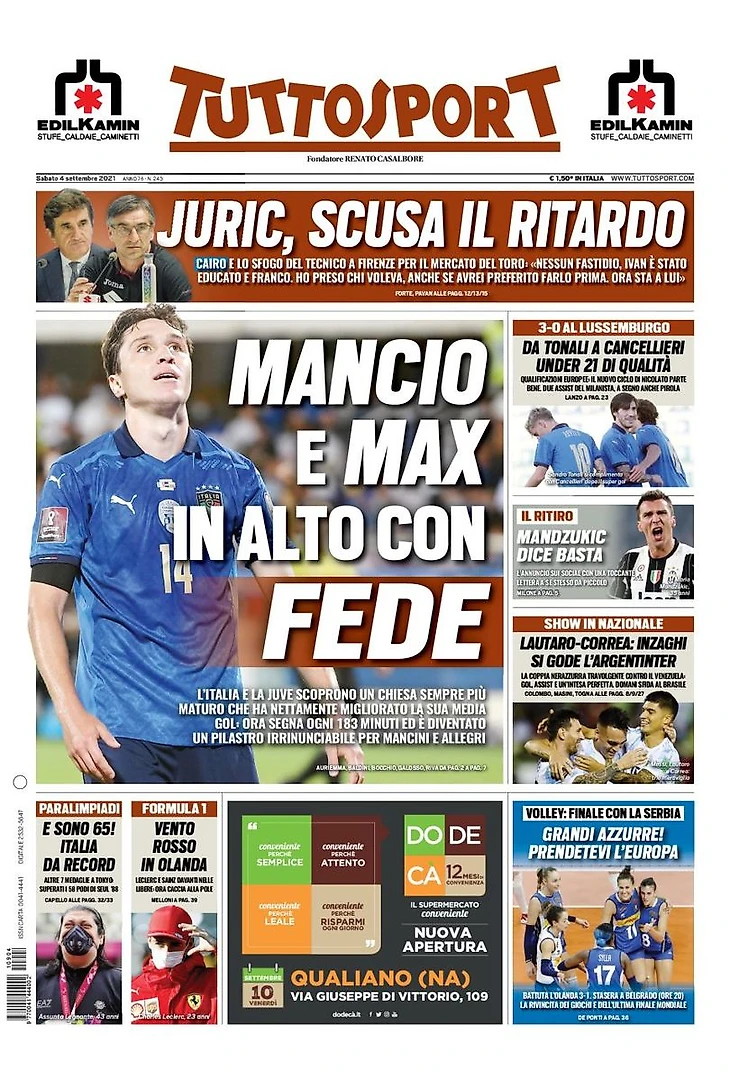 Манчо и Макс на высоте с Феде. Заголовки Gazzetta, TuttoSport и Corriere за 4 сентября