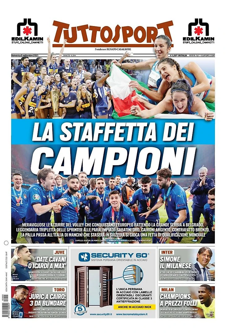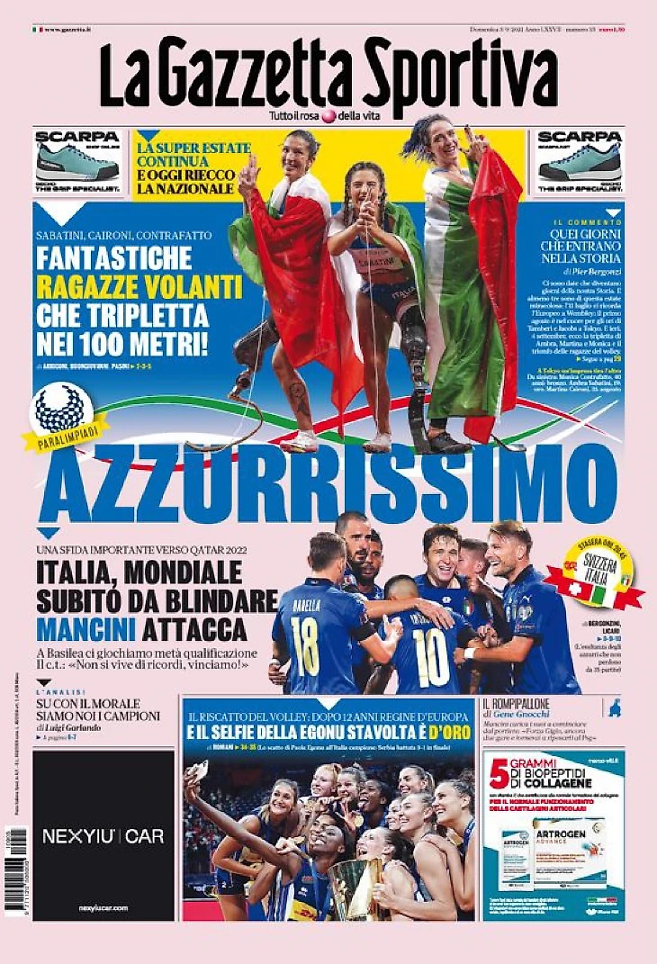 Чудесная женская волейбольная сборная, которая выиграла Чемпионат Европы, победив великую Сербию в Белграде. Легендарная триплета спринтеров на паралимпиаде: Сабатини – золото, Каирони – серебро, Контрафатто – бронза. Мяч переходит Италии Манчини, которая этим вечером в Швейцарии сыграет за часть квалификации на Мундиаль.