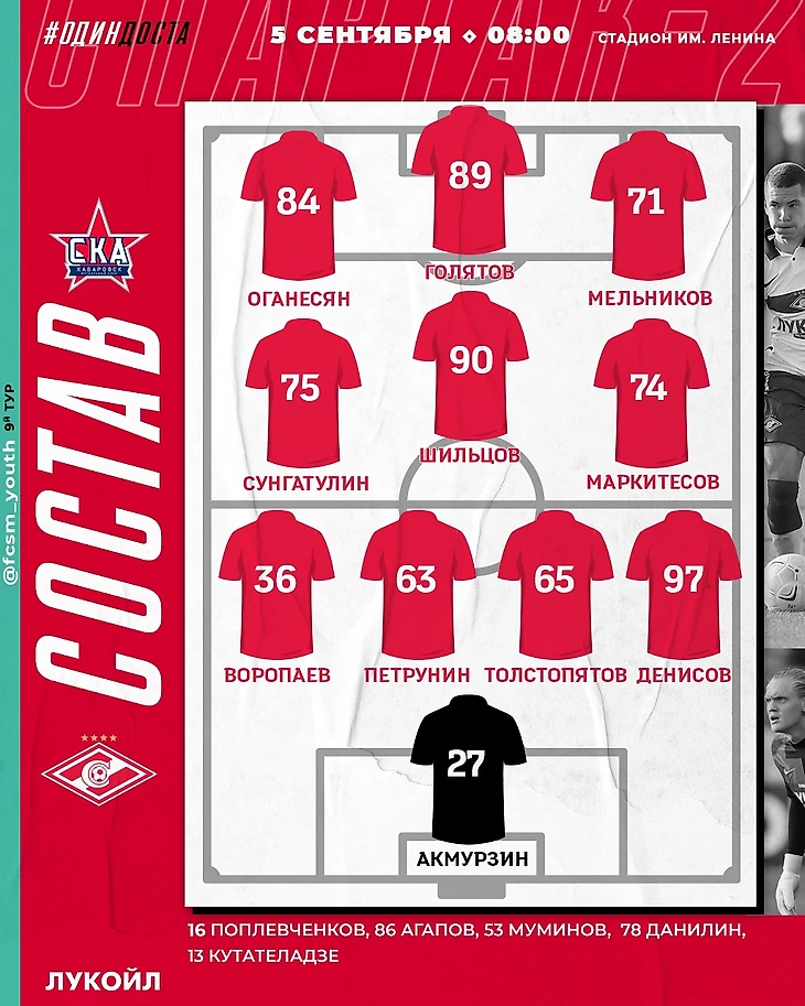 «Спартак-2»: Акмурзин, Денисов, Толстопятов, Петрунин, Воропаев, Сунгатулин (к) (Муминов, 90), Маркитесов, Шильцов (Кутателадзе, 69), Мельников, Оганесян, Голятов.