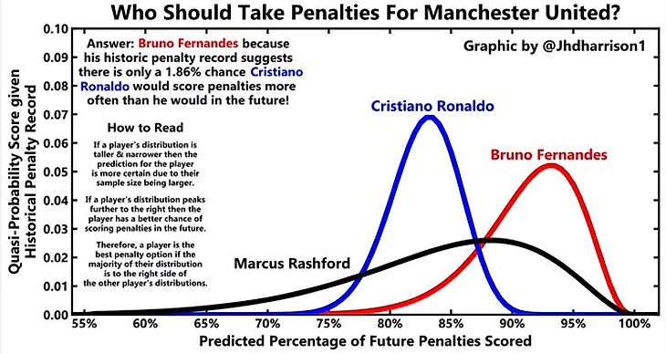 • Если же распределение игрока поднимается вверх ближе к правой стороне, то его шансы успешно бить пенальти в будущем выше, чем у двух остальных (здесь лидирует Бруну Фернандеш).