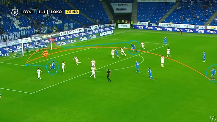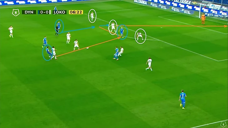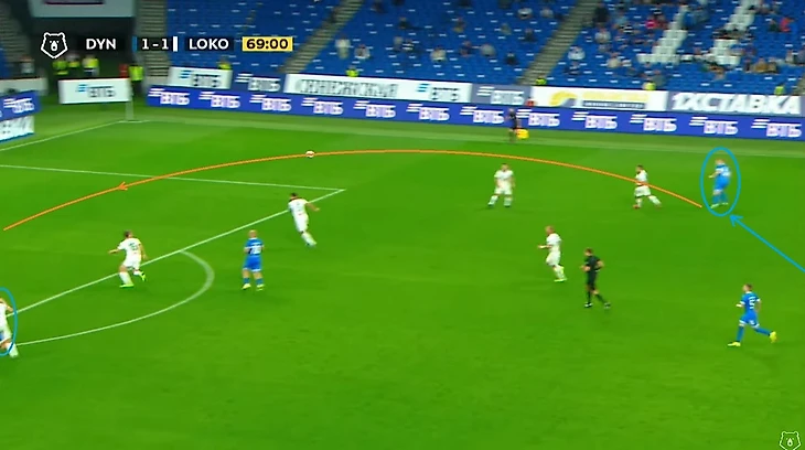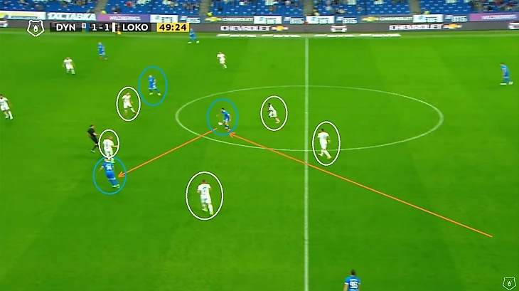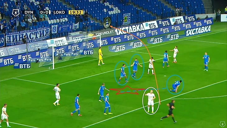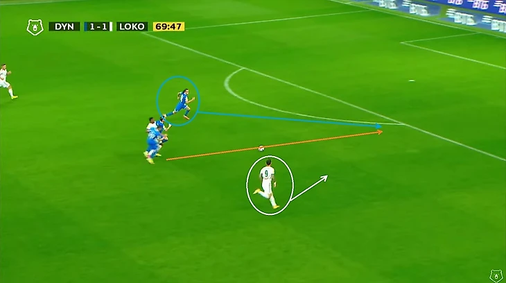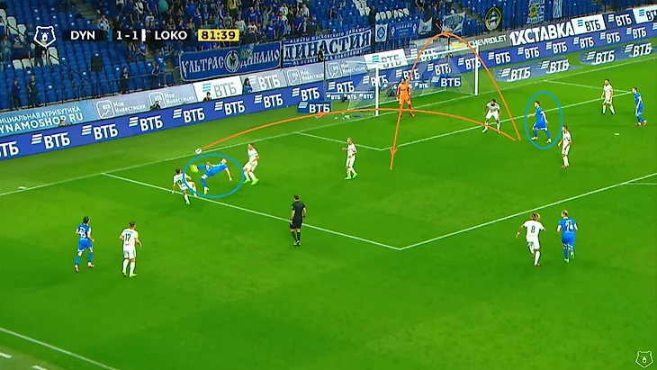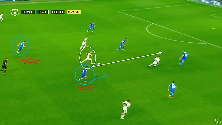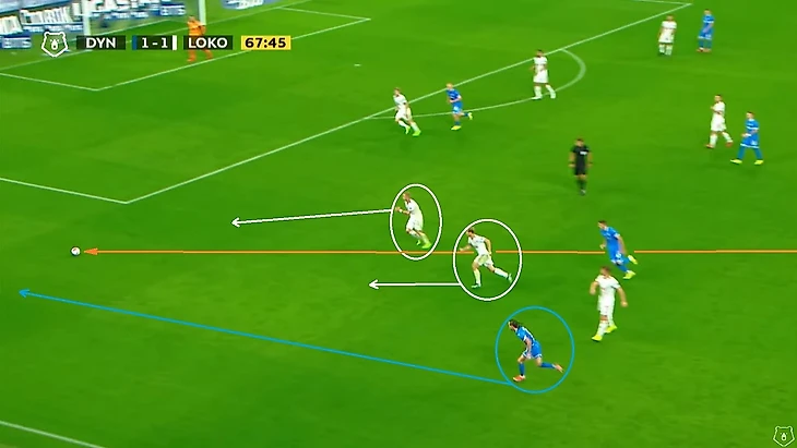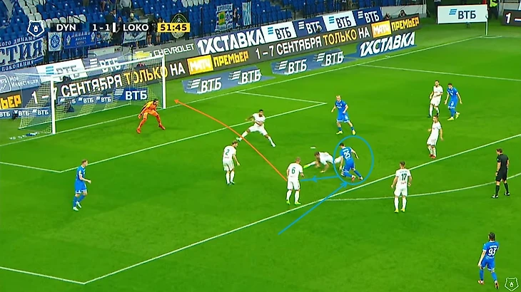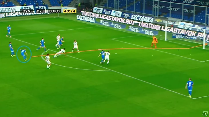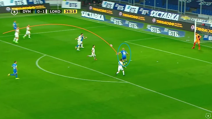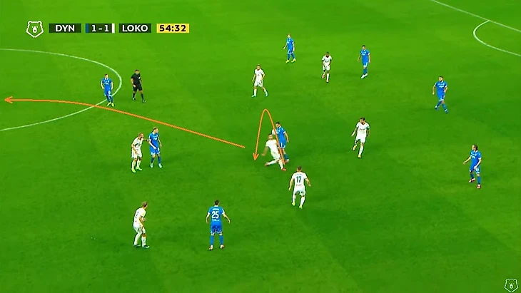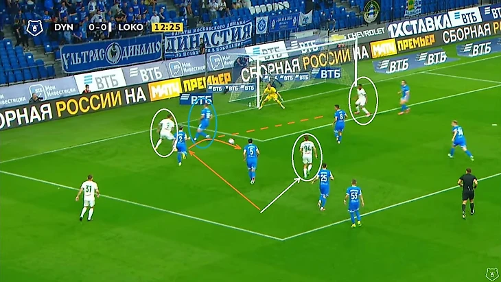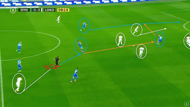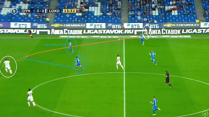 Как только Локо пытается контролировать мяч, хозяева тут же плотно накрывают соперника прессингом. Николо Моро дважды прерывал атаки гостей, и начинал контратаки Динамо. И если в первой Макаров упёрся в защитника, то вторая атака завершилась неточным ударом Захаряна. Здесь стоит отметить второй разрезающий пас Моро по центру и отыгрыш Тюкавина в два касания.