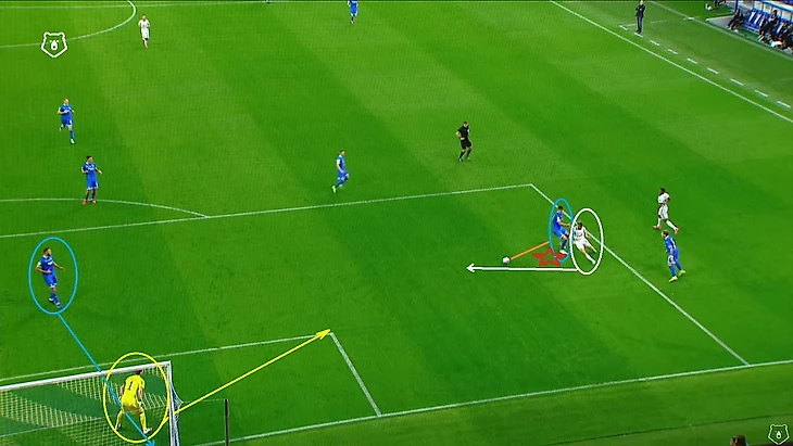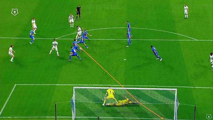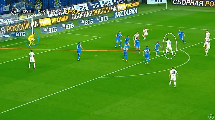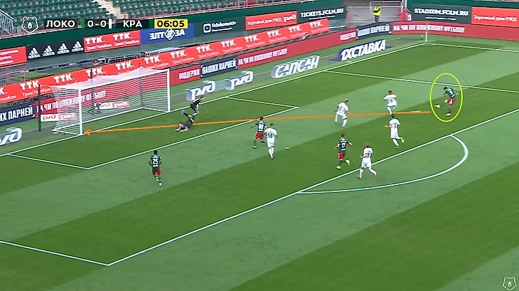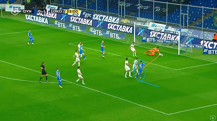 Локомотив экспрессом мчится в свою контратаку и лишь пятка Ордеца останавливает мяч на пути в пустые ворота. Здесь стоит отметить, как уже в не в первый раз обыгрывают Бальбуэна один в один. У нашего парагвайца есть как сильные, так и очень слабые стороны.