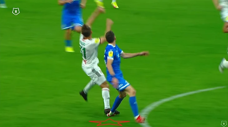 Минутой позже главный судья допускает ошибку не фиксируя нарушение на Макарове прямо перед штрафной. И VAR, к сожалению, тут не помощник, так как VAR может исправить ошибки судьи, если нарушение произошло в штрафной площади.