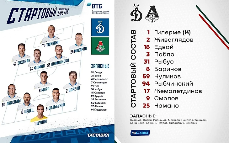 Состав. Перед перерывом на матчи сборных Динамо предстояло закрыть начало сезона в дерби против Локомотива в 6 туре, у которого произошло сразу две замены и две перестановки по сравнению с выигранным матчем у Краснодара. Пару Фёдору Смолову вместо Виталия Лисаковича составил Франсуа Камано, Дмитрий Рыбчинский поменял позицию правого защитника на левого полузащитника (вместо Камано), а на его место вернулся Дмитрий Живоглядов. В центре обороны вместо Станислава Магкеева вышел Пабло. И тут стоить отметить одну деталь: во всех 6 играх у Локомотива всегда были перемены в стартовом составе. А вот наш тренер, Сандро Шварц, похоже окончательно определился со стартовым составом нашей команды. Можно было допустить, что место в воротах займёт Игорь Лещук, но только потому, что в прошлом сезоне он сыграл в обоих дерби и смотрелся достаточно хорошо. Однако на шансы на его выход в старте были очень и очень маленькими. Очередная игра в запасе не стала для Игоря каким-либо разочарованием и уже через несколько дней он подписал новый контракт с Динамо на 4 года. Для справки: у Антона Шунина контракт заканчивается в Июне следующего года. Скорее всего контракт будет продлён — не ссорится же Динамо с агентом Захаряна. Но если мы, по итогам сезона, выйдем в групповую стадию Лиги Чемпионов или Европы, то команде нужно будет обязательно усилить вратарскую линию. А теперь переходим к разбору матча.