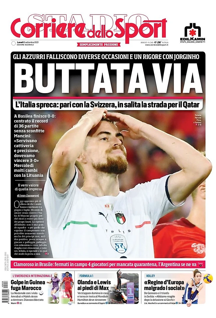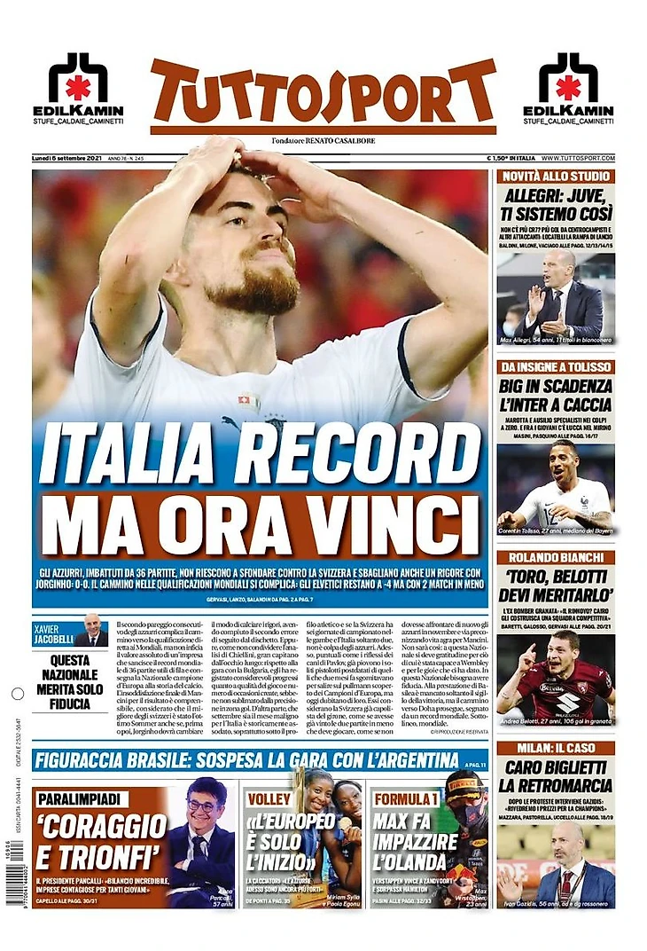Адзурри не реализовали различные шансы и пенальти Жоржиньо. Италия расточительна: ничья со Швейцарией, усложнилась дорога в Катар. В Базеле закончили 0:0: установлен рекорд в 36 матчей без поражений. Манчини: «Были необходимы злость и точность, должны были побеждать 3:0». В среду много замен с Литвой.