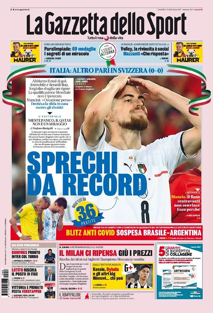 Италия: ещё одна ничья в Швейцарии (0:0). У нас голевая болезнь: Иммобиле и Берарди провалились, Жоржиньо не реализовал пенальти. Квалификация на Мундиаль не гипотезирована. Манчини: «Потерянный шанс». Решающей будет схватка дома со швейцарцами.