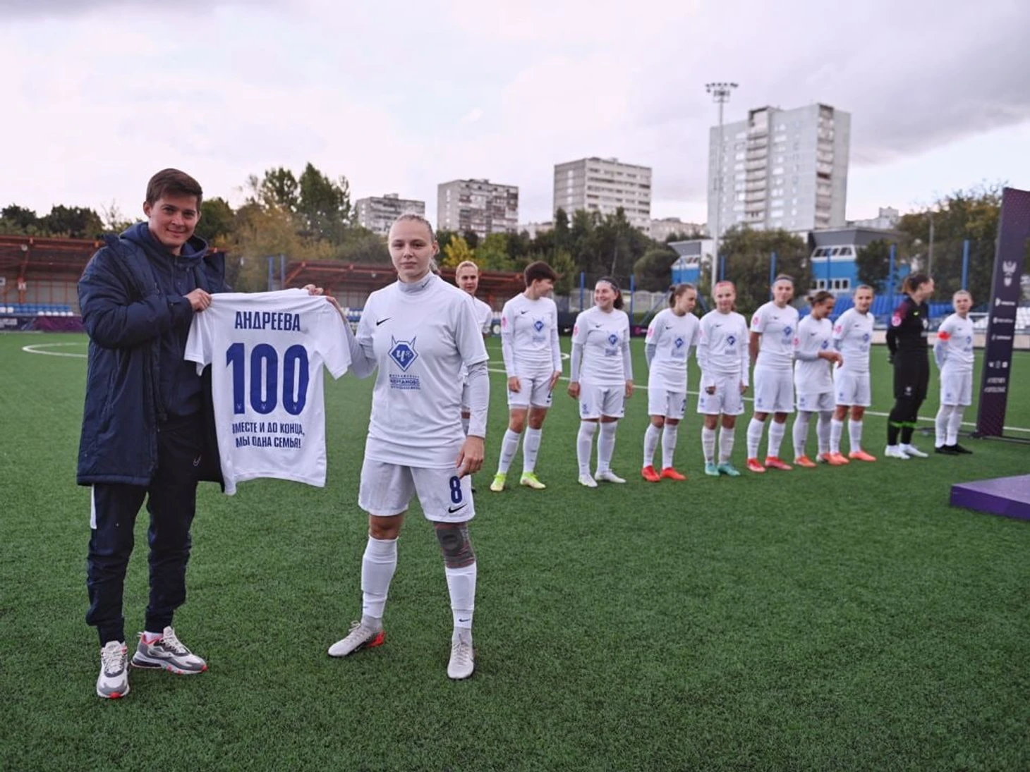Однако интересные события развивались не только на поле. 20-й тур стал особенным для Алены Андреевой. С одной стороны - из-за спортивных достижений. Андреева с 12 лет находится в "Чертаново" (переехала в интернат из Каменск-Уральского) и добралась до отметки в 100 сыгранных матчей за клуб в чемпионате России. Для турниров, где предусмотрено 30 туров, это, может, цифра и небольшая. Однако у женщин долгие годы каждый клуб играл только по 14 матчей (сейчас - 27).