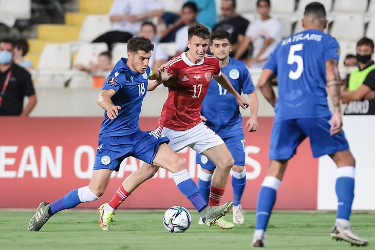 Совершенно неудачный момент был в конце тайма, 40-я минута матча, где российские игроки шли в контратаку пытаясь обыграть противника три в два. Головин простреливал в центральную зону штрафной голкипера сборной Кипра где на мяч набегали три игрока российской команды, но момент реализации был упущен, далее на остром моменте у самых ворот была серия ударов, но защитники не дали мячу попасть в ворота.