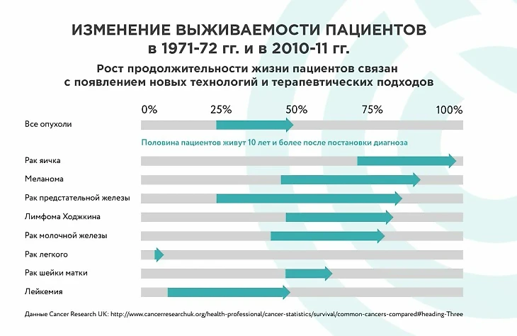 КЗ: Лучше посмотреть на статистику (фото ниже, прим.). Прогресс большой в лечении меланомы, рака предстательной железы, рака молочной железы – продолжительность жизни пациентов растёт.
