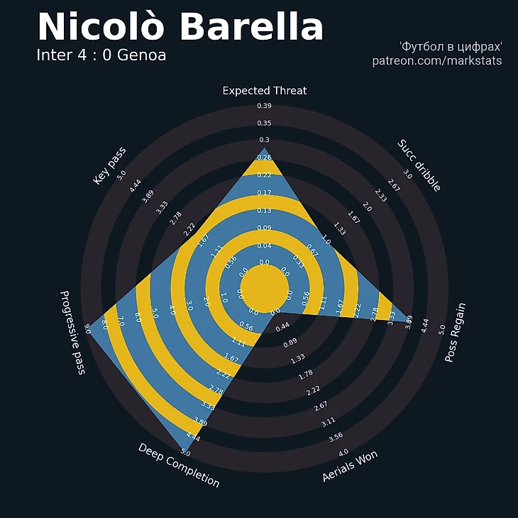 При более подробном рассмотрении можно заметить, что первое чем удивил новый главный тренер черно-синих это умышленным перегрузом левого фланга, куда к сверх активному Перишичу, который действовал строго на бровке подключался Чалханоглу, что во первых создавала огромные проблемы с подстраховкой в защите у Дженоа, а во вторых позволяло Барелле чувствовать себя гораздо свободнее на противоположным углу штраной, несмотря на более пассивного в атаке Дармиана на левом краю.