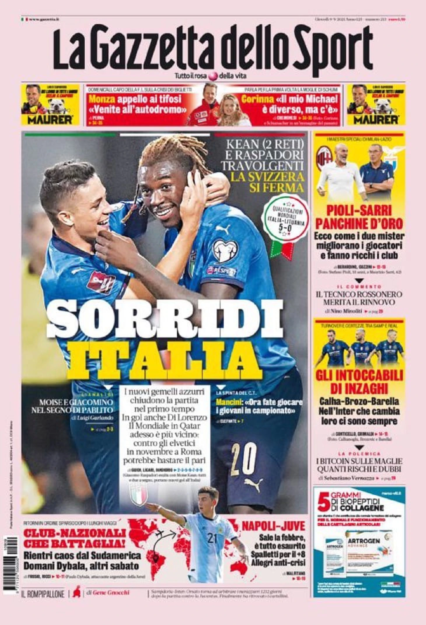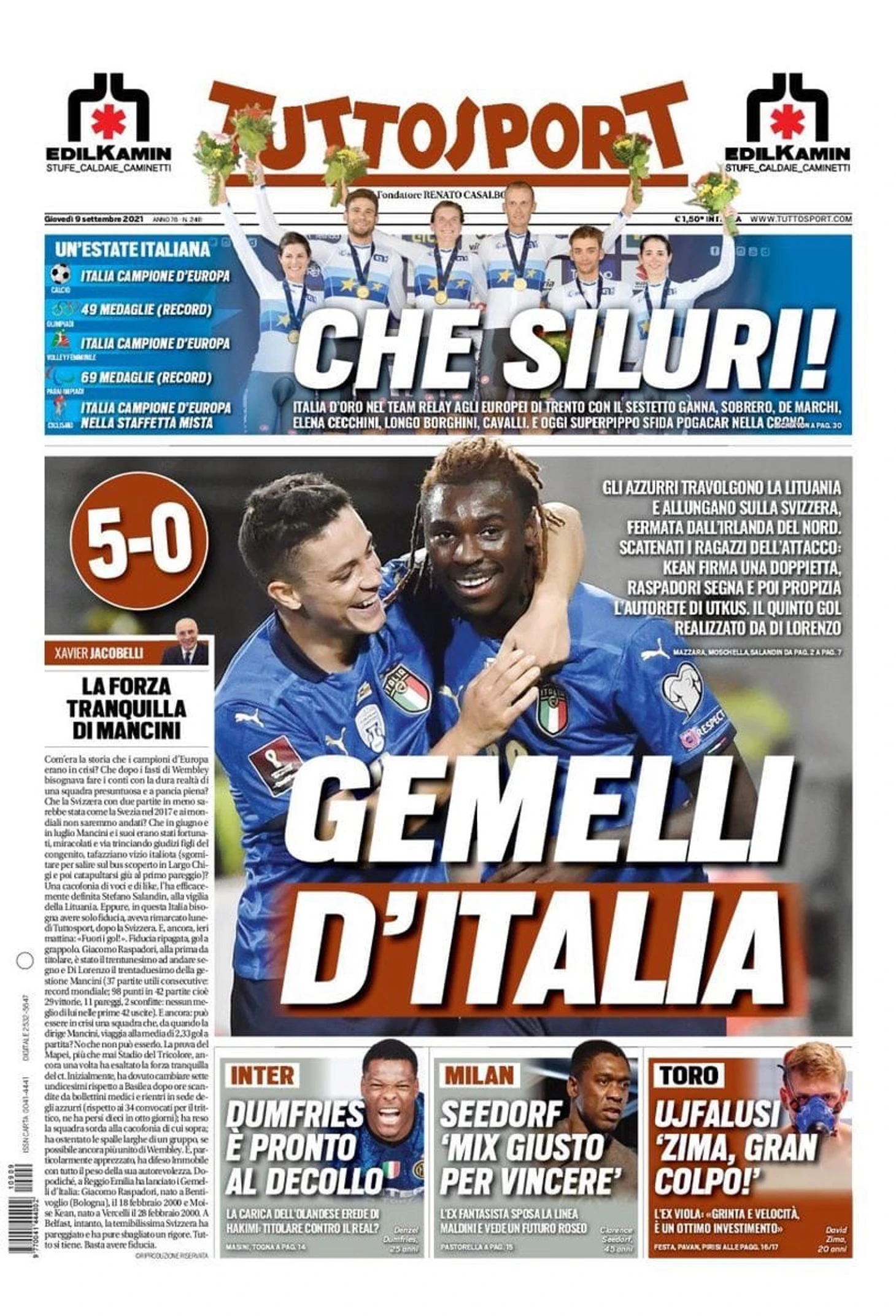 Кин и Распадори, шоу в сборной. Пять голов Италии против Литвы, ничья Швейцарии помогает на пути в Катар. Аплодисменты Манчини в адрес молодёжи: «Вперёд вот так».