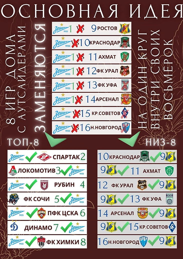 Домашний стадион лучших команд принимает практически исключительно топовые матчи. Возьмём для примера «Зенит». «Газпром-арена» в рамках формата в 15-ти матчах будет принимать, внимание: дважды «Спартак», дважды «Локомотив», дважды ЦСКА, дважды «Рубин», по одному разу «Динамо», «Сочи», «Химки», «Ростов», «Краснодар», «Ахмат», «Урал».
