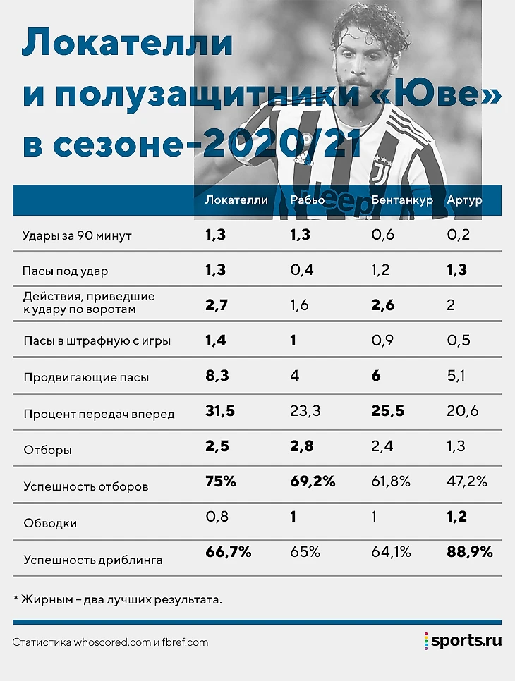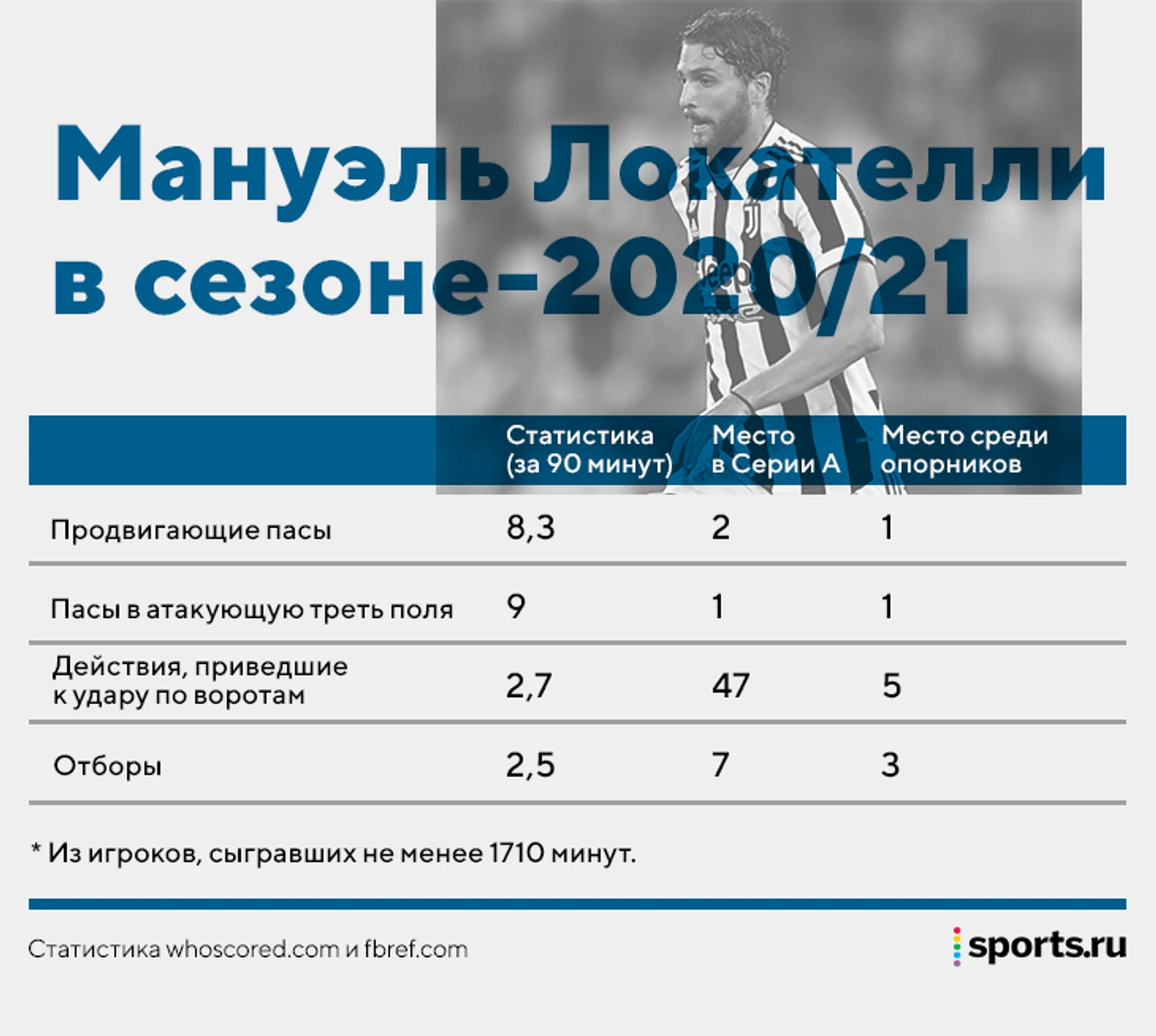 В первых матчах так и случилось. Аллегри использовал модель с двумя полузащитниками, но за динамику обычно отвечал партнер Локи – Бентанкур или Маккенни. Сам Локателли большую часть матча служил осью и поднимался выше, только если напарник застывал на одной линии. Случалось это относительно редко. Неудобный функционал спровоцировал падение всех ключевых цифр: Ману пасует, обводит и обостряет в несколько раз реже, чем в «Сассуоло».