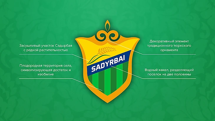 Село Садырбай, в котором будет располагаться команда, основано в 60-х годах XX века. Основным занятием местных жителей является земледелие, в связи с чем особое значение для сельчан представляет вода — канал, проложенный через центральную часть населенного пункта. Он питает плодородную половину села, где жителями возделываются культурные растения. Другая половина в летний период высыхает и растительность там редкая, типичная для полупустынной местности. Данную особенность ландшафта авторами было решено положить в основу замысла эмблемы местной команды.