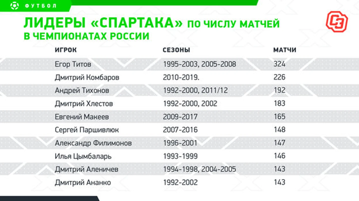 Егор Титов продолжает лидировать в списке спартаковских гвардейцев с огромным отрывом. Главные преследователи среди действующих игроков — Роман Зобнин и Квинси Промес — выходили на поле в 129 встречах, кроме них рубеж в 100 также разменяли Артем Ребров (113) и Георгий Джикия (112).