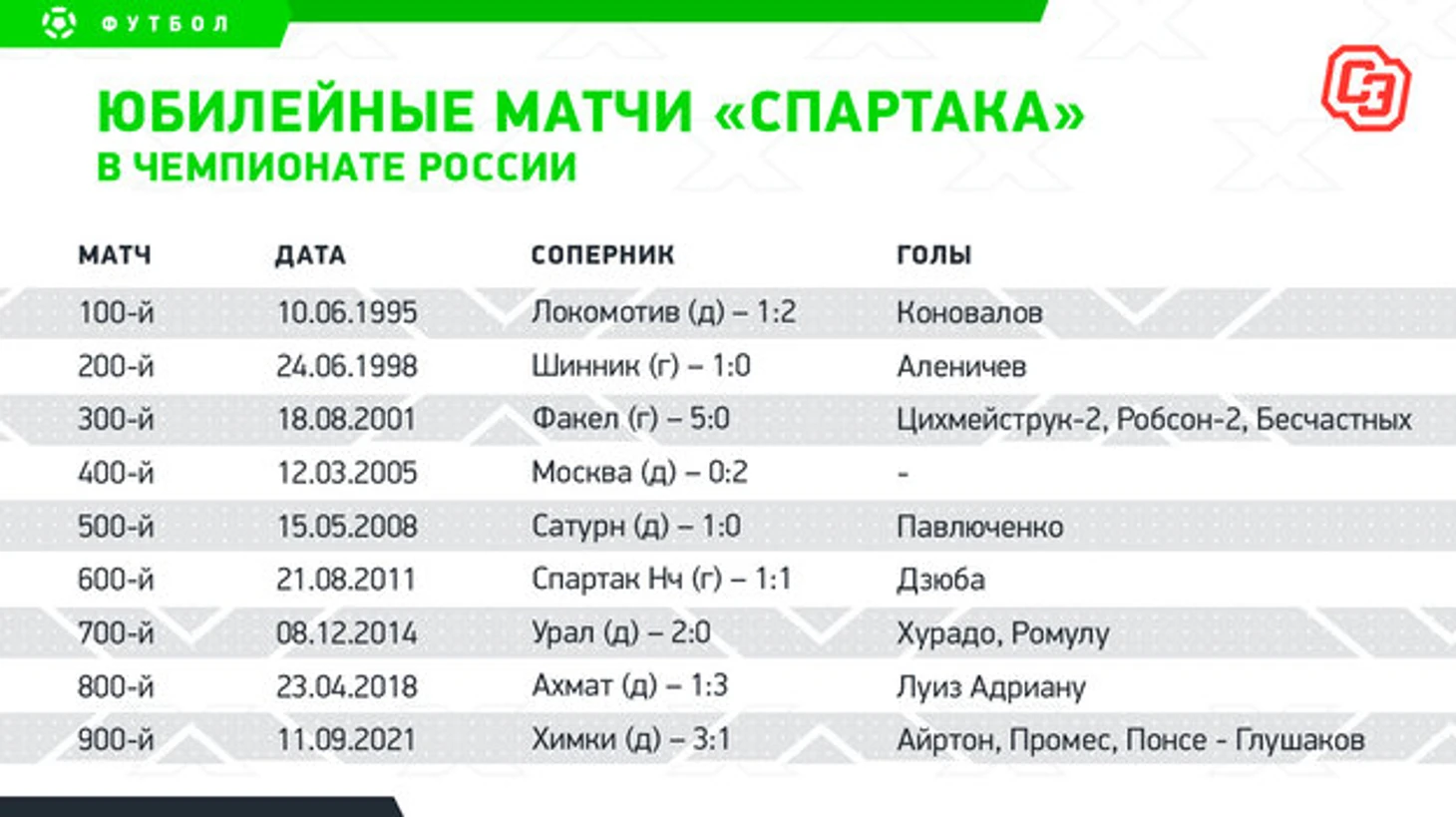 В юбилейных встречах красно-белые одержали пять побед при одной ничьей и трех поражениях. При этом только в 2001 году спартаковцы отпраздновали круглую дату более результативно. Тогда воронежский «Факел» получил от команды Олега Романцева пять мячей, сейчас «Химки» — три. Для Руя Витории субботняя игра оказалась седьмой во главе московской команды в чемпионате. Реже «Спартаком» руководили только «и. о.» — Игорь Ледяхов, Рауль Рианчо и Сергей Кузнецов. Тройку лидеров составляют Олег Романцев (более трети матчей команды), Валерий Карпин и Массимо Каррера.
