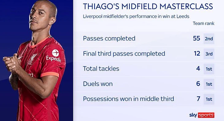 Тиаго был лучшим в 3-х статистических категориях в матче с «Лидсом».