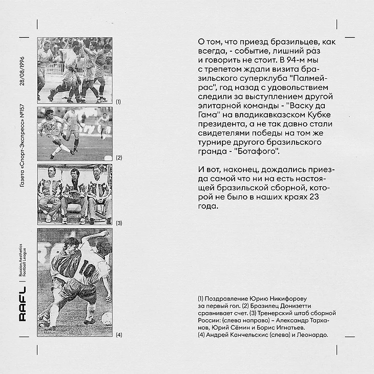 На товарищеский матч с бразильцами в 1996 году наша сборная вышла в запасном комплекте формы от Reebоk и, по воспоминаниям газеты «Спорт-Экспресс», огорчила Seleção, разыграв с ними красивую ничью