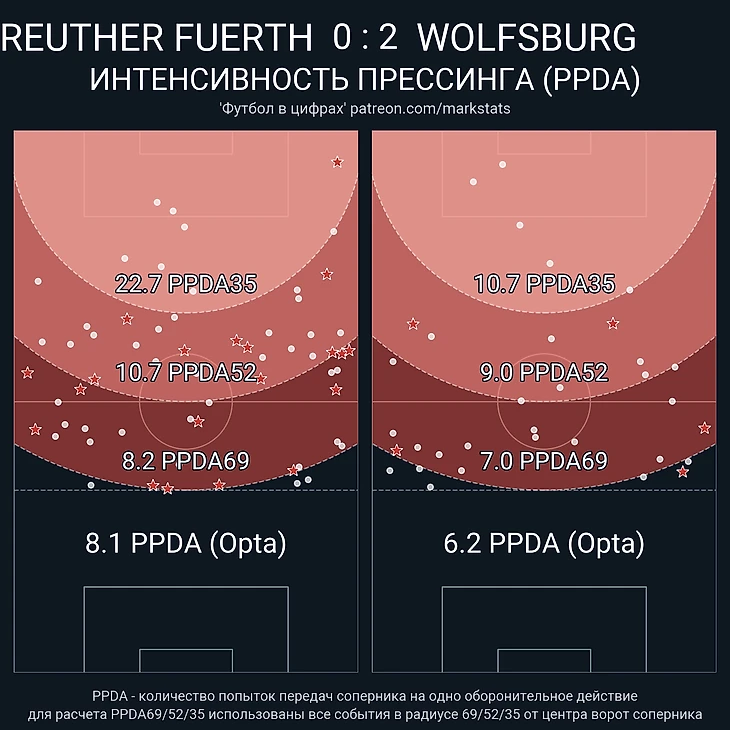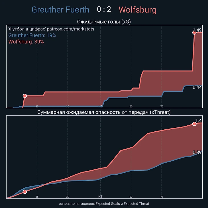 В 3 матчах Хоффенхайма из 4 играл ТБ 3,5 ( в сезоне 18/19 44.1% матчей 15/34; 19/20 35.2% матчей 12/34; 20/21 41.1% матчей 14/34) В 3 матчах из 4 Майнц не пропустил ( в сезоне 18/19 20,5% матчей 7/34; 19/20 14.7% матчей 5/34; 20/21 14.7% матчей 5/34) В 0 матчах Майнца из 4 играл ОЗ да ( в сезоне 18/19 55.8% матчей 19/34; 19/20 52.9% матчей 18/34; 20/21 61.7% матчей 21/34) Гройтер Фюрт 0:2 Вольфсбург ▪ Вероятность победы: 19.43% - 38.7% ▪ Явные голевые моменты (opta): 0 - 2 ▪ Deep completions: 5 - 9 ▪ Наклон поля (field tilt): 44% - 56% ▪ PPDA (Opta): 8.1 - 6.2