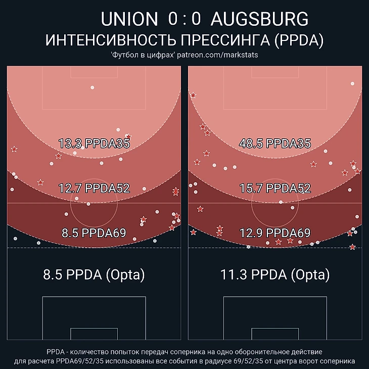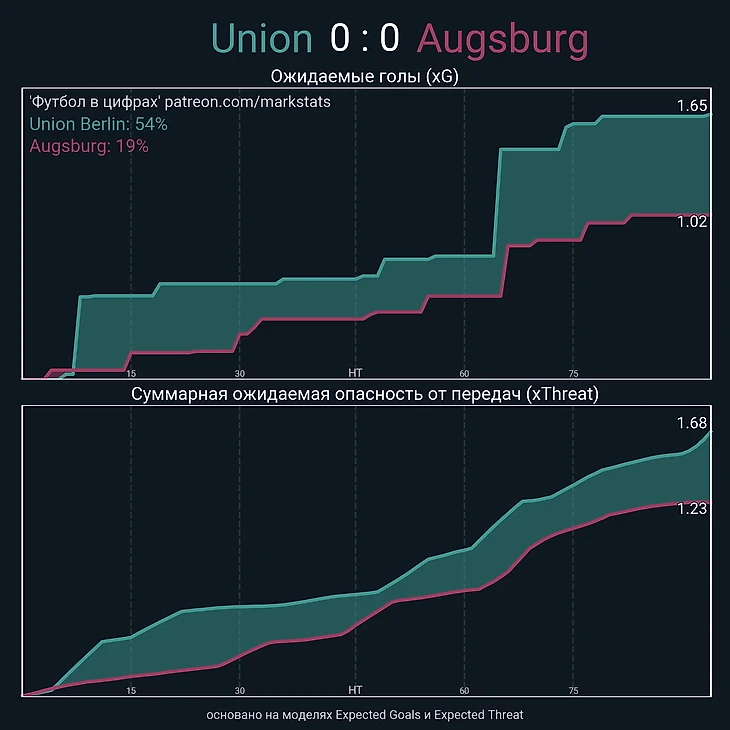 В 3 матчах из 4 Байера играл ТБ 3,5 ( в сезоне 18/19 50% матчей 17/34; 19/20 38.1% матчей 13/34; 20/21 16.4% матчей 9/34) В 3 матчах из 4 Байера играл ИТБ 2,5 ( в сезоне 18/19 32.3% матчей 11/34; 19/20 38.1% матчей 13/34; 20/21 16.4% матчей 9/34) В 3 матчах из 4 Байера играл ОЗ да ( в сезоне 18/19 67.5% матчей 23/34; 19/20 52.9% матчей 18/34; 20/21 58.8% матчей 20/34) Унион Берлин 0:0 Аугсбург ▪ Вероятность победы: 54.5% - 19.46% ▪ Явные голевые моменты (opta): 2 - 1 ▪ Deep completions: 0 - 4 ▪ Наклон поля (field tilt): 53% - 47% ▪ PPDA (Opta): 8.5 - 11.3