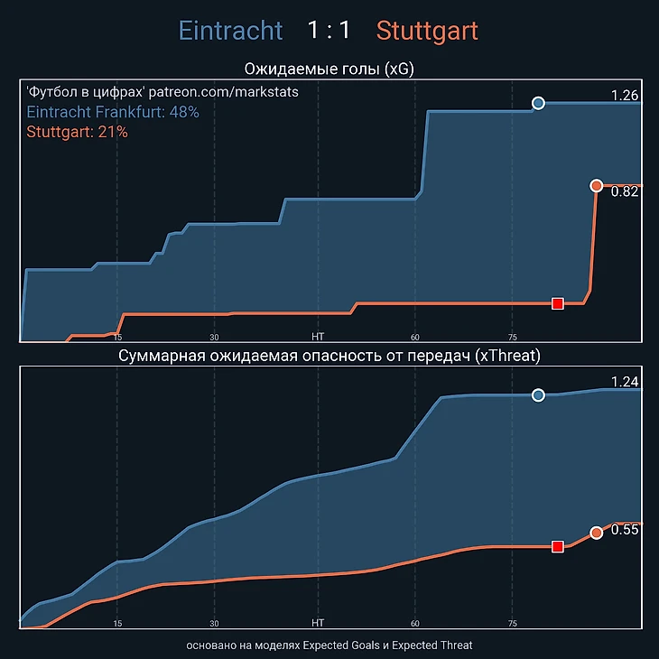 В 3 матчах Баварии из 4 играл ТБ 3,5 ( в сезоне 18/19 53% матчей 18/34; 19/20 61.7% матчей 21/34; 20/21 61.7% матчей 21/34) В 3 матчах Баварии из 4 играл ИТБ 2,5 ( в сезоне 18/19 56.6% матчей 19/34; 19/20 55.8% матчей 19/34; 20/21 52.9% матчей 18/34) В обоих домашних матчах РБ лейпцига играл ТБ 3,5 ( в сезоне 18/19 29.4% матчей 5/17; 19/20 52.9% матчей 9/17; 20/21 29.4% матчей 5/17) В обоих гостевых матчах РБ не забил ( в сезоне 18/19 17.6% матчей 3/17; 19/20 11.7% матчей 2/17; 20/21 11.7% матчей 2/17) Айнтрахт 1:1 Штутгарт ▪ Вероятность победы: 47.6% - 21.27% ▪ Явные голевые моменты (opta): 1 - 2 ▪ Deep completions: 5 - 2 ▪ Наклон поля (field tilt): 67% - 33% ▪ PPDA (Opta): 5.3 - 8.5
