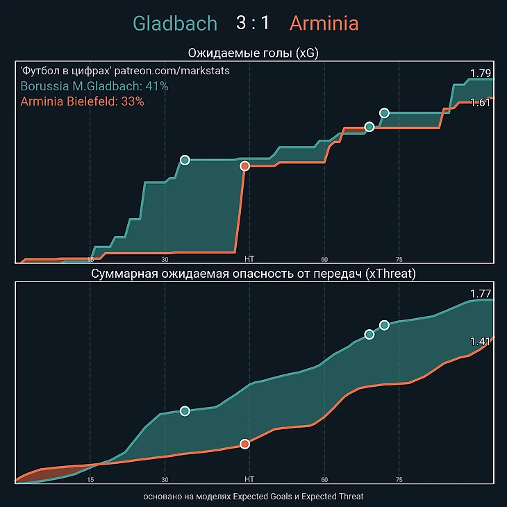 В 4 матчах Герты из 4 играл ТБ 2,5 ( в сезоне 18/19 61.7% матчей 21/34; 19/20 73.5% матчей 25/34; 20/21 55.8% матчей 19/34) В 3 гостевых матчах Герты из 3 играл ТБ 3,5 ( в сезоне 18/19 41.1% матчей 7/17; 19/20 52.9% матчей 9/17; 20/21 23.5% матчей 4/17) Боруссия Менхенгладбах 3:1 Арминия ▪ Вероятность победы: 41.44% - 33.37% ▪ Явные голевые моменты (opta): 3 - 3 ▪ Deep completions: 11 - 5 ▪ Наклон поля (field tilt): 45% - 55% ▪ PPDA (Opta): 6.6 - 10.9