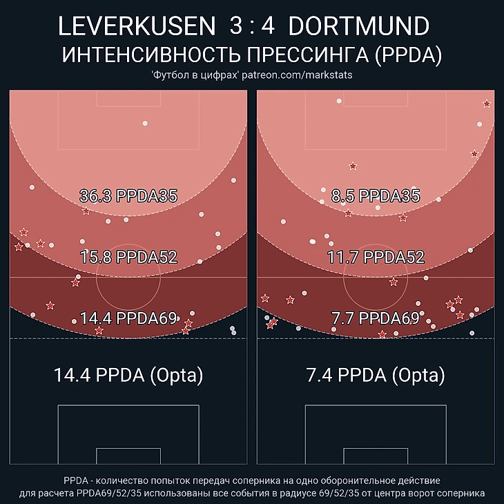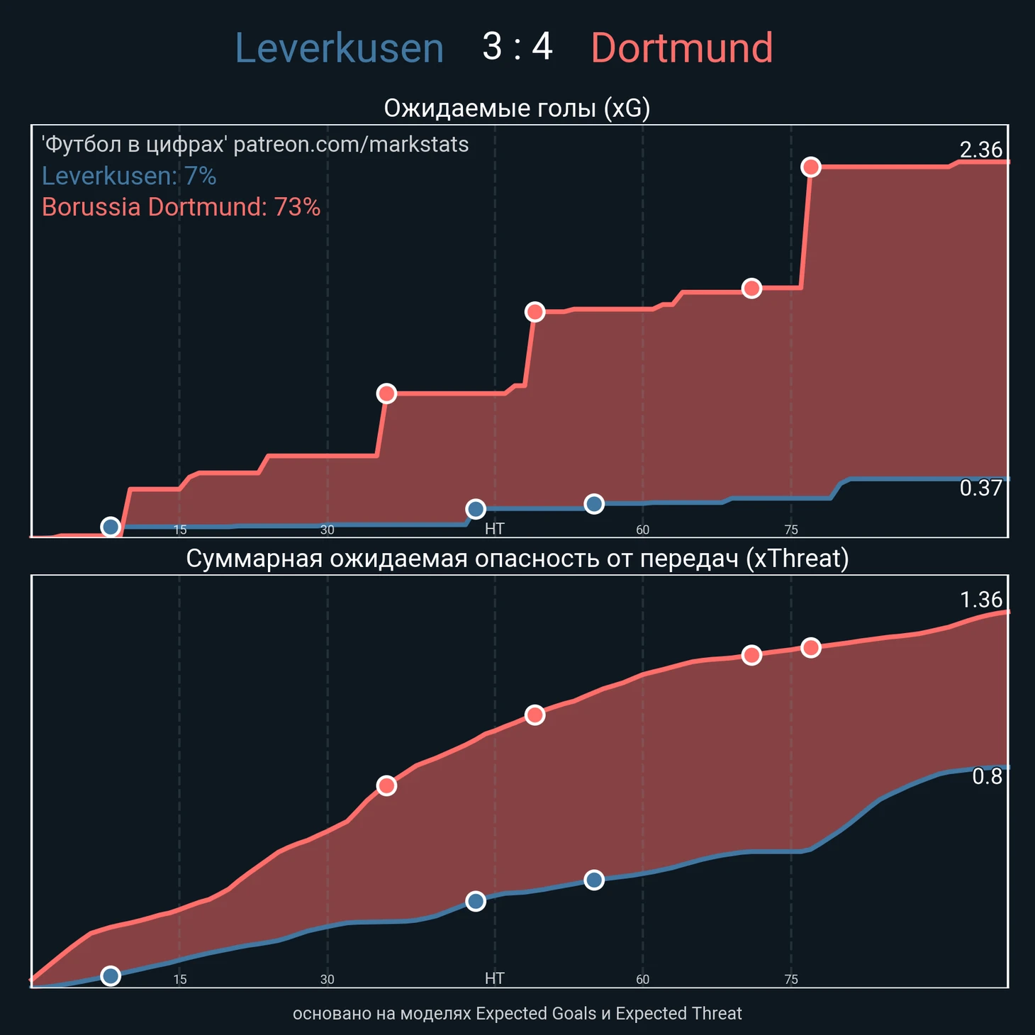 Четвертый тур Бундеслиги. Cтатистический разбор Байер Леверкузен 3:4 Боруссия Дортмунд ▪ Вероятность победы: 6.57% - 72.54% ▪ Явные голевые моменты (opta): 0 - 4 ▪ Deep completions: 5 - 9 ▪ Наклон поля (field tilt): 34% - 66% ▪ PPDA (Opta): 14.4 - 7.4
