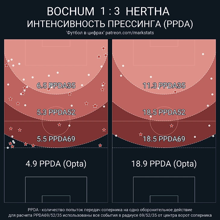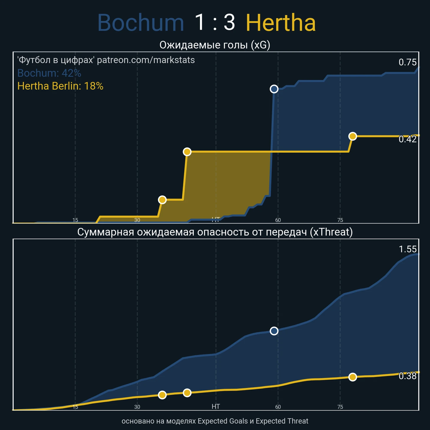 В 3 матчах Штутгарта из 4 играл ОЗ да ( в сезоне 18/19 44.1% матчей 15/34; 20/21 67.5% матчей 23/34) В 3 матчах Штутгарта из 4 играл ТБ 3,5 ( в сезоне 18/19 38.2% матчей 13/34; 20/21 41.1% матчей 14/34) Бохум 1:3 Герта Берлин ▪ Вероятность победы: 41.88% - 17.68% ▪ Явные голевые моменты (opta): 1 - 1 ▪ Deep completions: 3 - 1 ▪ Наклон поля (field tilt): 80% - 20% ▪ PPDA (Opta): 4.9 - 18.9